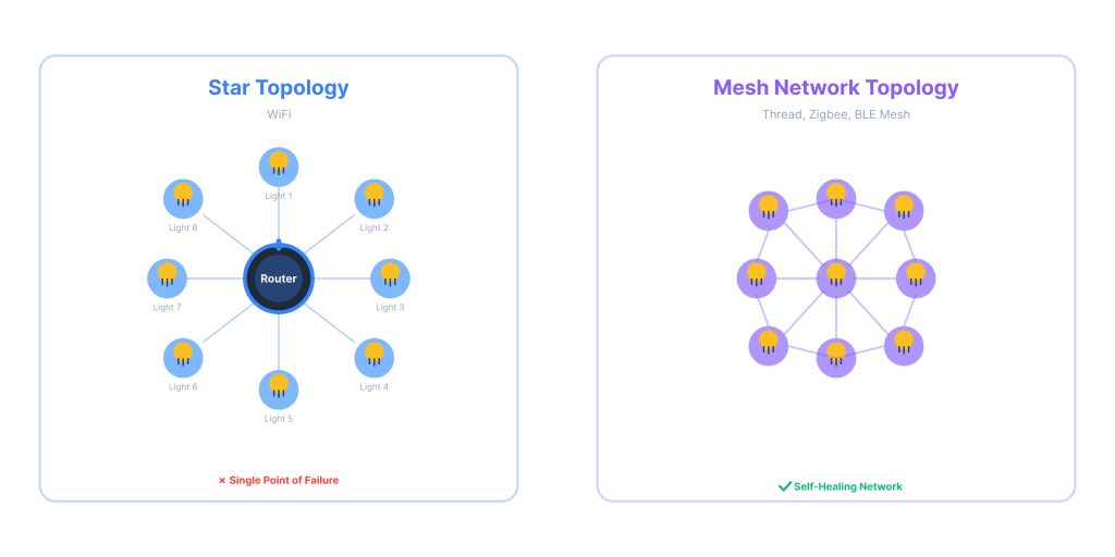 Many people think “more lights = more hassle,” but with mesh technology, the opposite is true. In Zigbee and Thread networks, the more lights you add, the more stable the network becomes. With Wi-Fi, however, the opposite happens: More lights → More pressure on the router → Increased latency → More frequent dropouts.